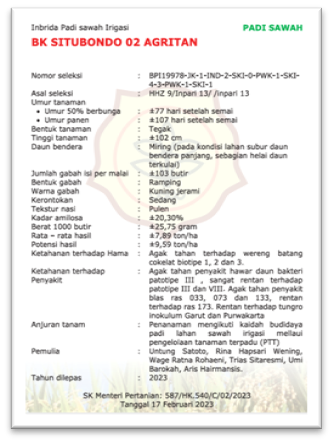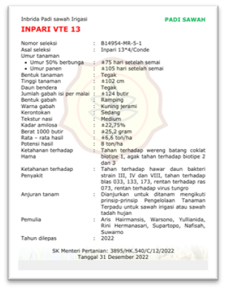 Berikut ini adalah beberapa varietas unggul baru komoditas padi yang dilepas oleh Kementerian Pertanian Republik Indonesia dalam 3 (tiga) tahun terakhir (2022-2023).