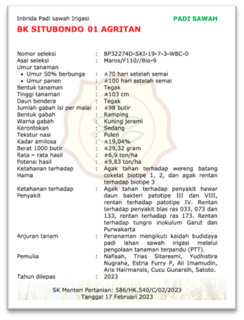 Kementerian Pertanian Republik Indonesia telah melepas banyak varietas-varietas unggul baru untuk komoditas padi sejak Tahun 1940 – 2022 sebanyak 499 varietas terdiri dari 391 varietas padi inbrida dan 108 varietas padi hibrida. Daftar varietas unggul baru yang sudah dilepas oleh Kementerian Pertanian dengan karakteristik masing-masing dapat dilihat pada link berikut: https://balikom.info/Varietas-Unggul-Baru-KementanRI