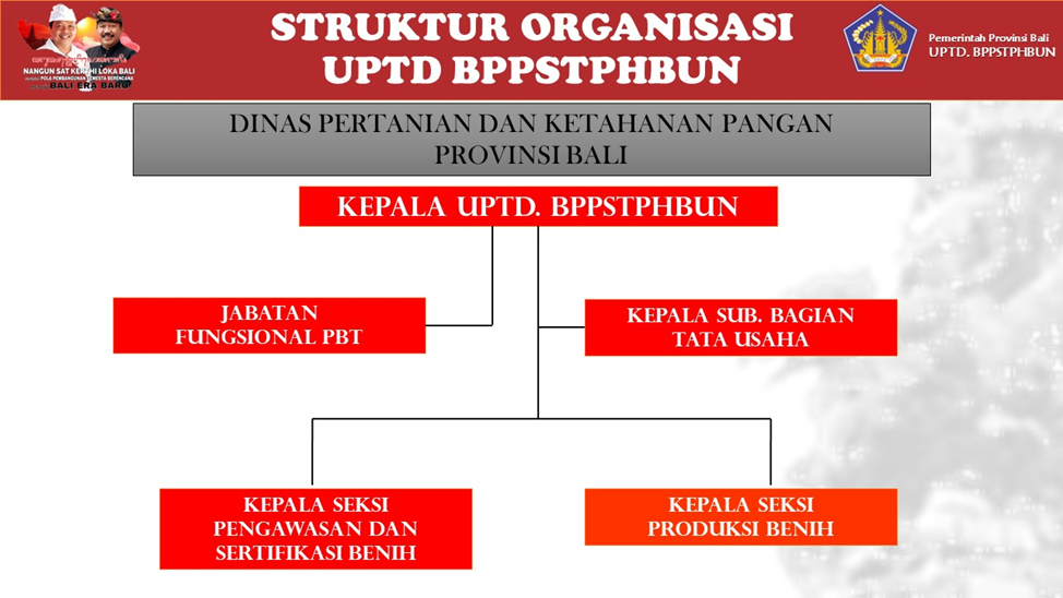 UPTD. Balai Pengawasan, Sertifikasi Benih Tanaman Pangan, Hortikultura dan Perkebunan merupakan unit kerja di lingkungan Pemerintah Provinsi Bali yang mempunyai tugas melaksanakan kegiatan teknis operasional dan/atau kegiatan teknis penunjang serta Urusan Pemerintahan bidang Pertanian yang bersifat pelaksanaan dari Dinas dalam pengawasan mutu, sertifikasi benih serta pengujian mutu benih tanaman pangan, hortikultura dan Perkebunan yang berasal dari varietas unggul.